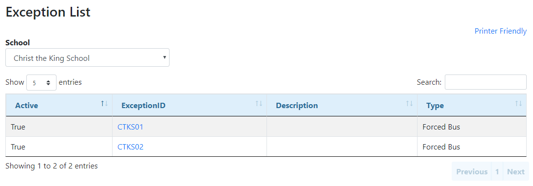 The Exception List tool creates a list of all the exception boundaries for an individual school. Clicking on an ExceptionID in the Exception List will redirect you to a map of the exception boundary.