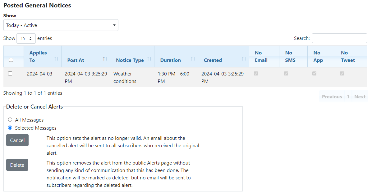 •Delete or Cancel Alerts – Removes the General Notice from the public side of the web page. The cancel action will keep a record of its posting for archival use. The delete action removes all records of the postings existence. This is useful for postings added by mistake.